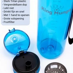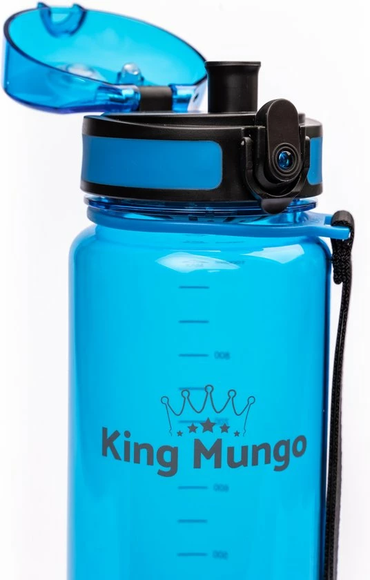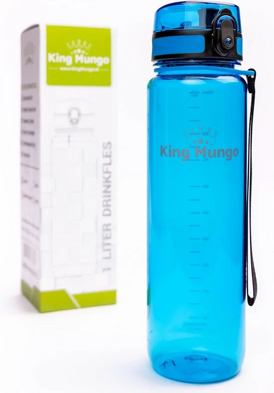 Hoge kwaliteit drinkfles 1 liter, lekvrij en zeer comfortabele grote 1 liter drinkfles / bidon / drinkbus voor dagelijks gebruik of als sportfles van hard Tritan plastic. Met unieke lekvrije dop die met 1 hand snel te openen is. Een uniek sluitmechanisme, vergrendel de dop zodat de grote waterfles niet lekt in je tas. Deze herbruikbare en dus duurzame blauwe King Mungo 1000 ml design waterflessen zijn BPA vrij (veilig en geen plastic smaak aan het water).