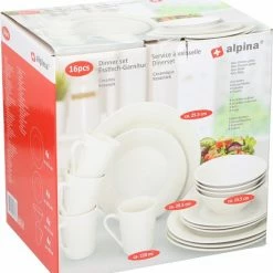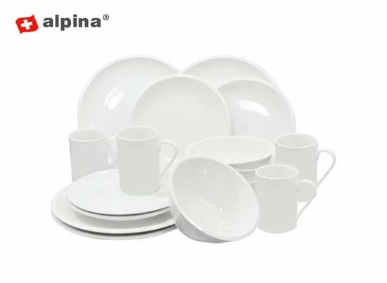 Deze set van Alpina bestaat uit 4 dinerborden, 4 dessertborden, 4 kommen en 4 bekers.