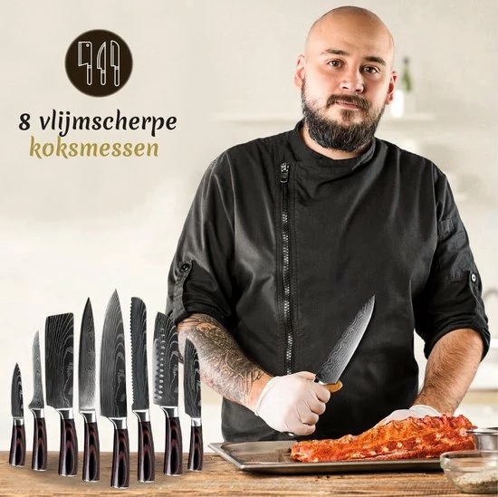 De messen zijn uniek aangezien het grootste deel met de hand is gemaakt. Gesmeed uit Duits High Carbon staal, waardoor de messen hard en zeer scherp zijn. Een prachtige en duurzame messenset die niet kan ontbreken in jouw keuken.
