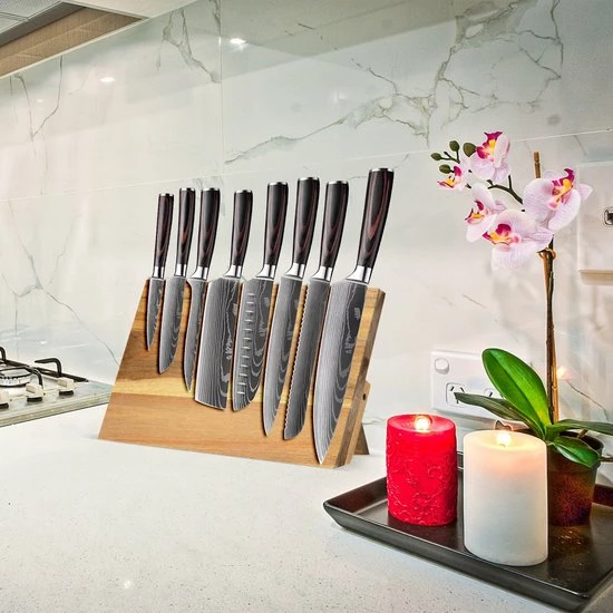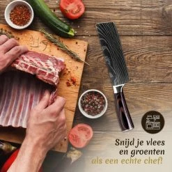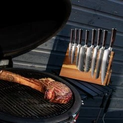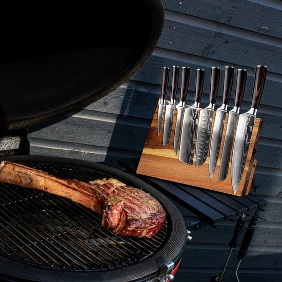 Bent u op zoek naar een scherpe messenset met blok die scherp blijft? Bbq Meating heeft de perfecte oplossing voor u! Onze messen hebben vlijmscherpe lemmeten en een luxe design. De combinatie van het Pakka hout en het Japanse staal 820 maakt onze messen zeer licht en gemakkelijk in gebruik. Vanwege zijn zachtheid is pakkahout verkozen boven andere materialen zoals metaal of kunststof die meer (ongewenste) druk op de spieren van uw hand geven bij het snijden. Bent u klaar met onze messen om uw groenten te snijden? Vis, vlees of brood? Niets is te veel voor onze messen.