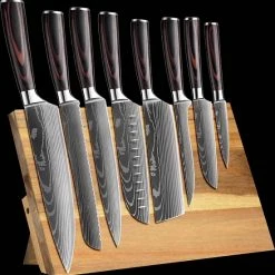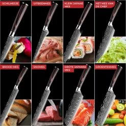 Deze gloednieuwe set Japanse messen bevat alles wat u nodig hebt om te koken. Deze collectie messen van hoge kwaliteit zal aan al uw snijbehoeften voldoen, inclusief een schilmesje voor het schillen van fruit, een koksmes voor het hakken van kruiden en het in blokjes snijden van uien, en een broodmes. Perfecte messenset voor dagelijks gebruik!