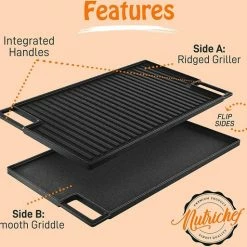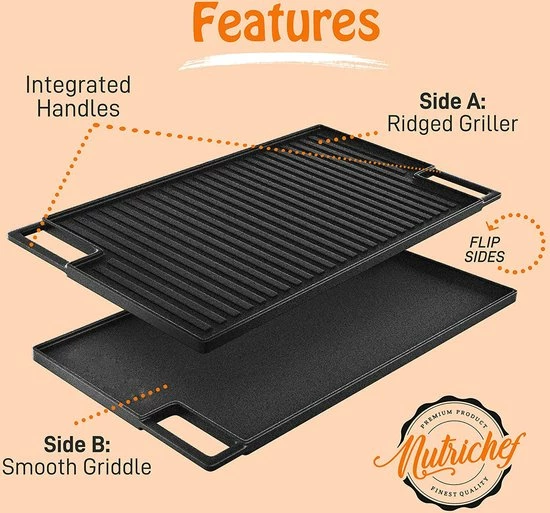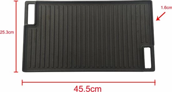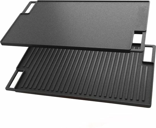 Dit gietijzeren rooster van BBQNovation is een must voor iedere BBQ liefhebber en keukenprins(es). Dit rooster is namelijk aan twee kanten te gebruiken. De ene kant is glad voor het bakken van bijvoorbeeld een eitje, groentes of garnaaltjes en de andere zijde is geribbeld en daardoor geschikt voor grotere objecten als een steak of een visje waar u de mooie Maillardstreepjes wilt zien.