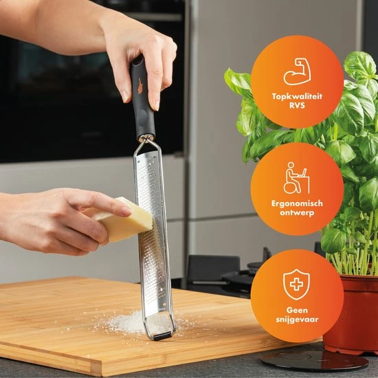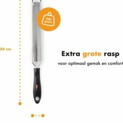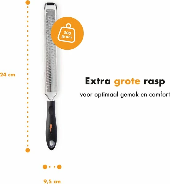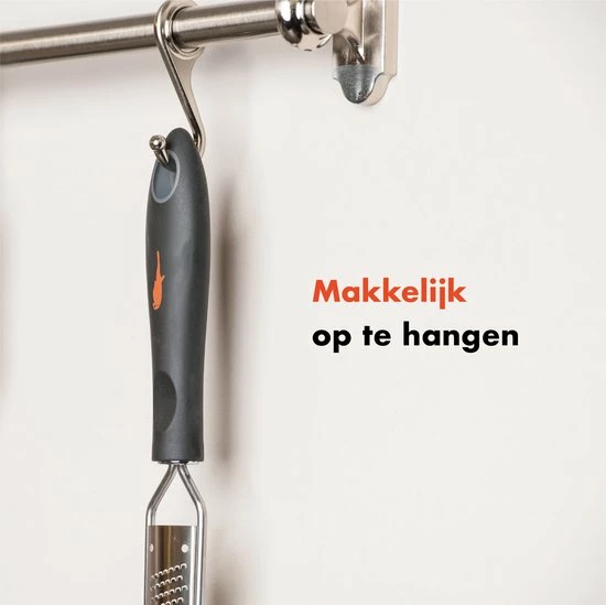 - Handig en snel: De stevige grip samen met het lange, scherpe, roestvrijstalen, mes, zorgen er voor dat jij met zo min mogelijk inspanning, snel, veilig kan raspen. Daarnaast is de rasp voorzien van een handig ophangsysteem. Zo kun jij je rasp een mooi plekje in je keuken geven. Wel zo handig!