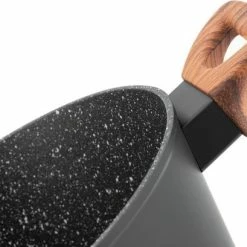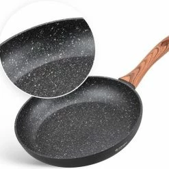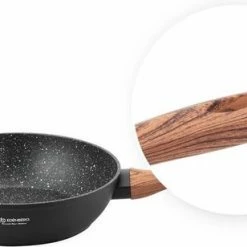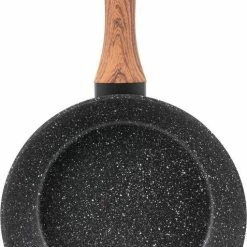 - Gegoten aluminium, met keramische/marmeren coating, ideaal voor aanbraden, en vetarm koken