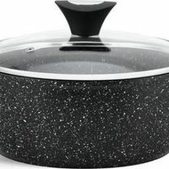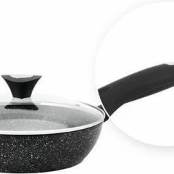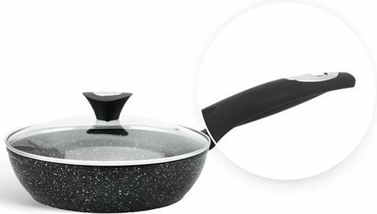 - Gegoten aluminium, met keramische/marmeren coating, ideaal voor aanbraden, en vetarm koken