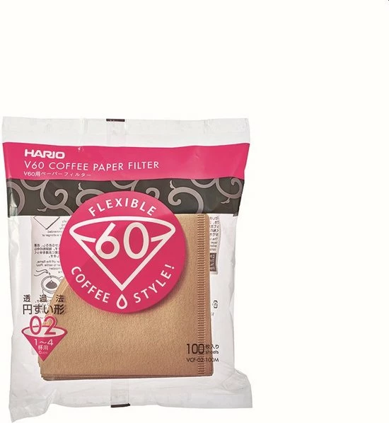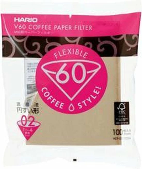 Verpakking bevat 100 bruine (ongebleekte) papieren filters in de maat 02.