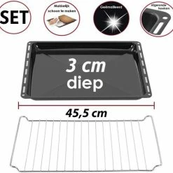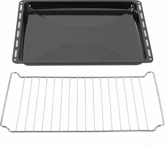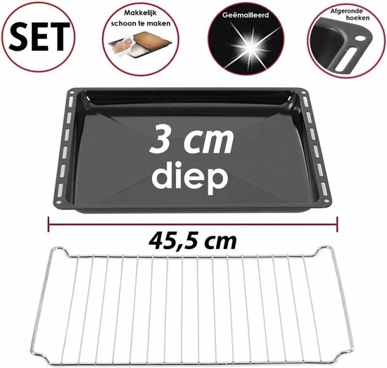 Deze set bestaat uit een geëmailleerde bakplaat van 3 cm diep met een afmeting van 455 x 375 x 30 mm en een verchroomd ovenrooster met een afmeting van 455 x 375 mm.