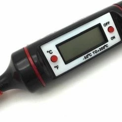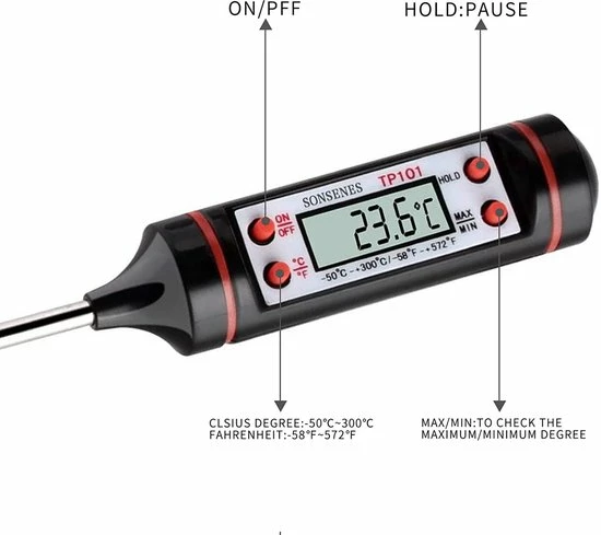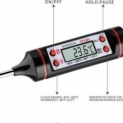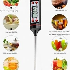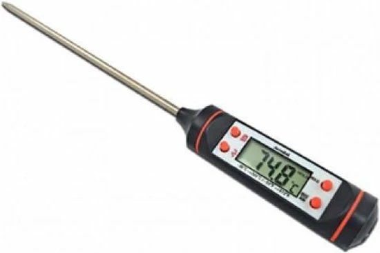 Met deze digitale thermometer is het erg gemakkelijk om de temperatuur van je voeding en vloeistoffen te kunnen meten. De meetsonde van de thermometer is van RVS en door zijn scherpe punt kan deze makkelijk in alle soorten voedsel worden gestoken. De thermometer heeft een simpele bediening en is voorzien van een automatische power-off functie. Met deze thermometer bereik je de ideale temperaturen in de keuken of bij de BBQ.