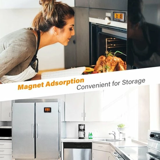 Het magnetische ontwerp maakt het mogelijk om de thermometer aan te brengen op oppervlakken van huishoudelijke apparaten zoals ovens, koelkasten of andere metalen oppervlakken, handig voor opslag.
