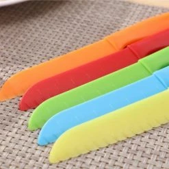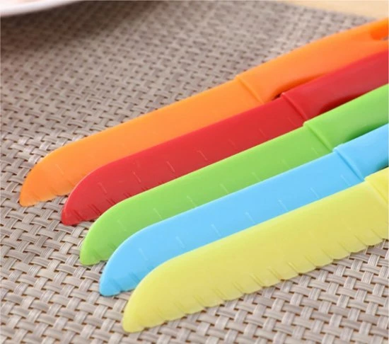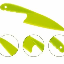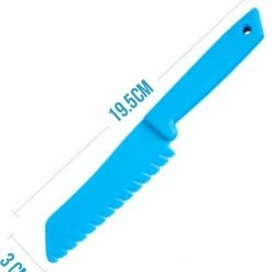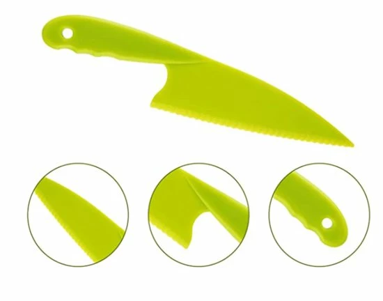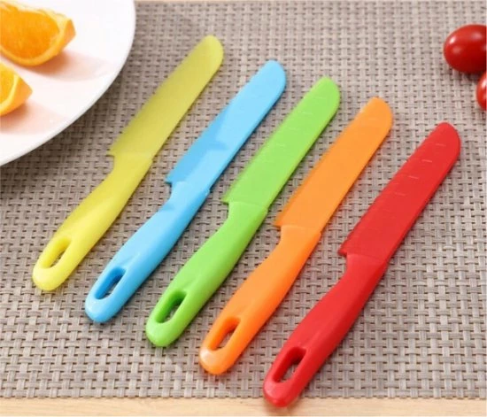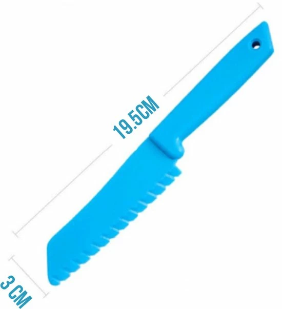 De messen bestaan uit kunststof en heeft een kartelrandje om mee te snijden. Hiermee kan uw kind dus veilig snijden en zal het snijden niet al te moeizaam gaan (het zal bij hard voedsel wel iets lastiger gaan, maar vooral groenten en fruit zijn goed te snijden met de messen). Toch zijn de messen niet al te scherp waardoor uw kind zich niet zal bezeren.