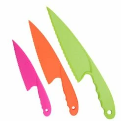 De messen komen in een set van 8 met verschillende grootte. Ook hebben de messen verschillende kleurtjes: groen, roze, geel, blauw en oranje. Deze kleuren zijn heel vrolijk en zullen het koken nog gezelliger en leuker maken.