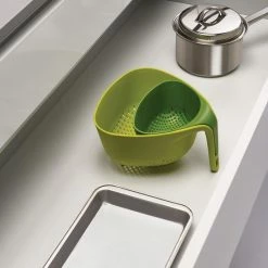 Was het prut van de wortels of giet de gekookte aardappels af in de gootsteen. Denk je dat dit niet past? Tuurlijk wel! De Joseph Joseph vergieten zijn in de vorm van een driehoek waardoor ze in iedere gootsteen passen en ook nog eens stapelbaar zijn.