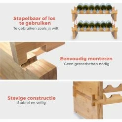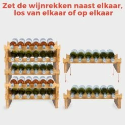 Het bamboe wijnrek van KitchenBrothers is enorm handig, heeft drie lagen en biedt ruimte voor in totaal 18 wijnflessen. Of het nu gaat om rode, witte en mousserende wijnen je kunt ze allemaal laten rusten in dit fijne bamboe wijnrek. De rekken zijn eenvoudig zelf te monteren, zijn stapelbaar en tevens los van elkaar te gebruiken. Zo kun je zelf de manier van etaleren kiezen; een stelling in de breedte of in de hoogte. Zet de rekken naast elkaar, los van elkaar of op elkaar plaatsen. Opties alom! De stevige bamboe constructie voorkomt wiebelen, kantelen of vallen.