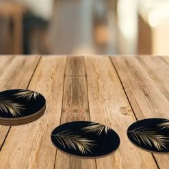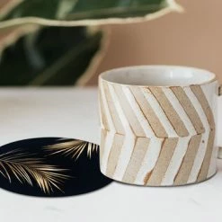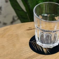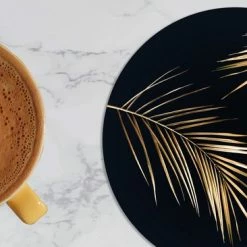 Deze ronde onderzetters voor glazen bevatten een design van gouden palmbladeren op een zwarte achtergrond. De klassieke kleurencombinatie en unieke print geven een chique uitstraling aan je interieur.
