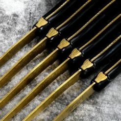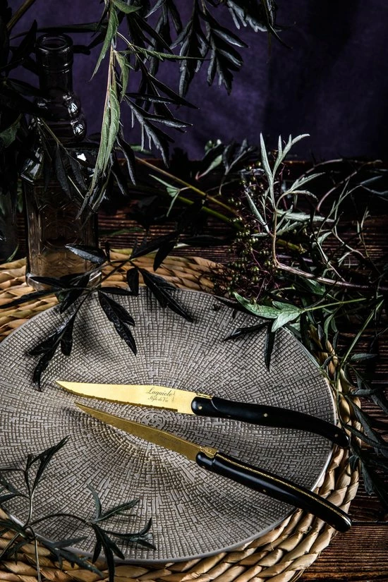 Met deze Laguiole Style de Vie steakmessen uit de Prestige Line serie snijdt u met gemak door elk stukje vlees. Door de goudkleurige stonewash afwerking zien de messen er luxe en uniek uit. Het lemmet heeft een dikte van 1,8mm en is gekarteld. De totale lengte van de steakmessen zijn 22,5cm. Door het gekarteld lemmet zijn de steakmessen niet alleen geschikt voor vlees maar kan het ook gebruikt worden voor het snijden van bijvoorbeeld pizza’s of harde groente. De steakmessen zijn gemaakt van RVS en kunststof en worden geleverd in een zwart houten tray. De Stonewash-finish is vaatwasmachine bestendig tot maximaal 55 graden. Hierdoor raden wij aan de messen met de hand te reinigen.