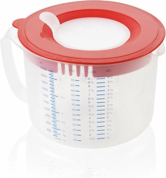 - Maatbeker, mengkom en bewaarkom met spatdeksel en vershouddeksel.