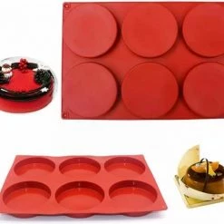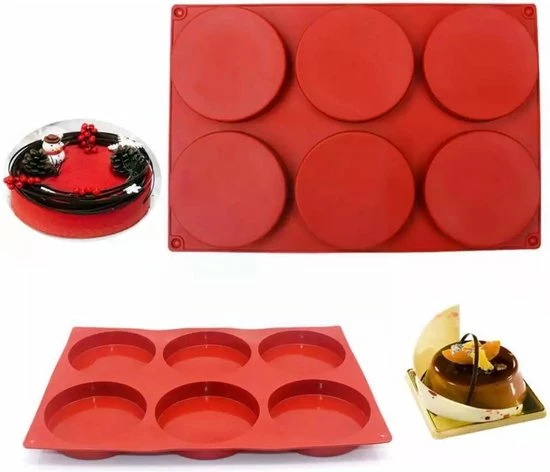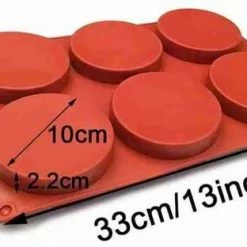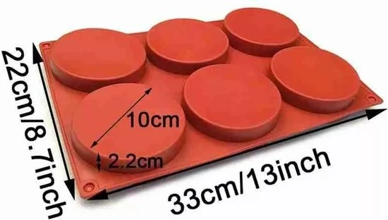 De bakvorm is 22 x 33 centimeter. De zes holtes zijn 10 centimeter in diameter, en 2.2 centimeter diep.