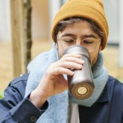 Voor dag en dauw de deur uit? Opstaan doe je toch nét even makkelijker met de isoleerbeker Ellipse in stijlvol Titanium. Een kop hete cappuccino of rooibosthee; hoe ver de trein, bus of auto je vandaag ook brengt, je geniet altijd van een verwarmend drankje onderweg. De koffiebeker to go is gemaakt van dubbelwandig roestvrij staal, zo blijft je drankje lekker warm. Tot de laatste slok! Speciaal voor koffielovers: als je de deksel opendraait komt de verse koffiegeur je meteen tegemoet. Hmm… dat is pas lekker wakker worden! Net als bij je favoriete mok kun je langs de volledige rand drinken. Je drankje blijft tot 4 uur warm en tot 8 uur koud in de thermosbeker. De buitenkant van de isoleerbeker blijft koel en droog, hoe warm of koud de inhoud ook is. Om zolang mogelijk van je product te kunnen genieten raden wij aan de gekleurde coffee to go beker met de hand af te wassen. De kunststof onderdelen van de dop mogen wel gewoon in de vaatwasser.