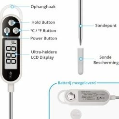 Deze veelzijdige digitale thermometer voor zowel binnen (keuken) als buiten is een ideale thermometer om de kerntemperatuur van vlees, vis, melk, water, thee te meten tijdens het bakken, koken of BBQ’en. Je kunt deze thermometer ook gebruiken om de temperatuur van andere vloeistoffen te meten.