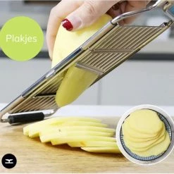 Door de 4 verwisselbare opzetstukken is deze groentesnijder geschikt voor verschillende soorten voedingswaren. Van rauwkost tot kaas, aardappels of noten; deze 4-in-1 schaaf is dรฉ alleskunner in uw keuken voor eindeloze toepassingen. De verschillende opzetstukken zijn eenvoudig te verwisselen door een handig klik systeem. Hiermee heeft u de keuze tot gelijke plakjes, julienne of fijne snippers.