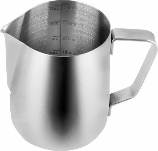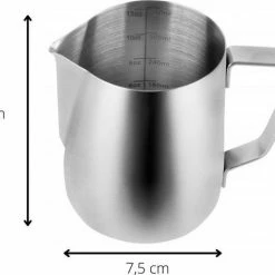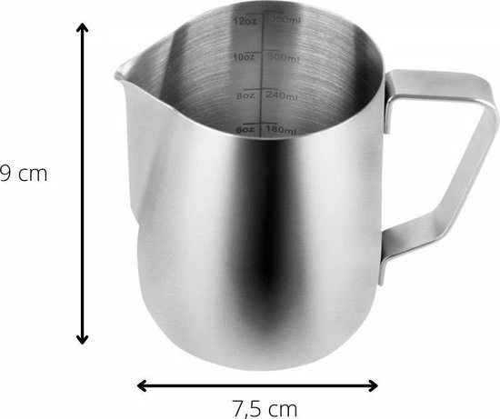 De melkkan is aan de binnenzijde voorzien van een interne maatbeker van 350 ml/12 oz. Deze maten staan aan één zijde gegraveerd. Het melkkannetje is groot genoeg voor minimaal één kopje koffie. Daarnaast is de melkopschuimkan groot genoeg om zelf melk in te schuimen.