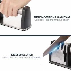 Deze hoogwaardige kwaliteit messenslijper van Mesha is onmisbaar in elke keuken. De 4-stage messenslijper is ideaal om al je botte messen en scharen weer vlijmscherp te maken. Deze zware messenslijper voelt perfect aan en geeft veel comfort tijdens het slijpen. Door gebruik van extreem sterk kunststof, metaal en keramiek gaat deze messenslijper een leven lang mee. De combinatie rvs met zwart kunststof geeft deze slijper een prachtige uitstraling.