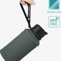 - DETAILS: Deze donkergrijze waterfles is gemaakt van roestvrij staal, vrij van schadelijke stoffen en BPA-vrij. Hij is 22,5 x 10 cm groot en geschikt voor 1,3 liter water of andere dranken. Met zijn 235 g is hij ook nog eens bijzonder licht!