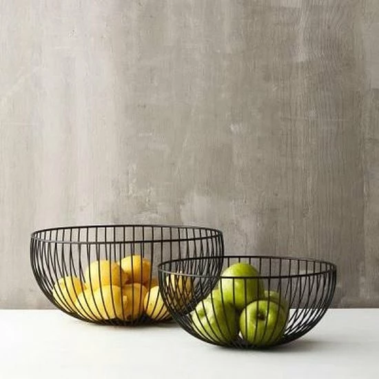 Fruitmanden in metaal ogen aangenaam door de fraaie gebogen lijnen en laten tegelijkertijd zien welke groenten of fruit ze bevatten. Functioneel, met decoratieve toets en tegelijkertijd licht en transparant.