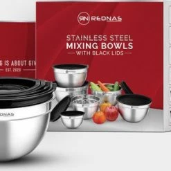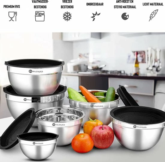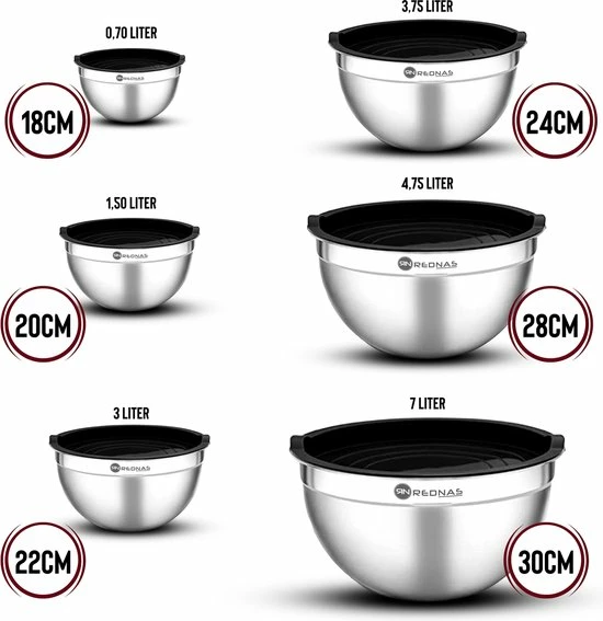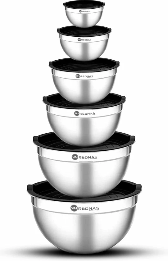 Je gebruikt ze overal voor: de Rednas meng-/bewaar-/serveer-/beslagkommen. Of het nu is voor het mixen van beslag, het marineren van vlees, het serveren van salades of voor de schillen van je aardappelen. Deze Rednas Mengkommen met luchtdichte deksels zijn van de hoogste kwaliteit RVS en staan straks dagelijks op jouw aanrecht. De mengkomset bestaat uit 6 kommen van verschillende formaten: 0.7 liter, 1.5 liter, 3 liter, 3.75 liter, 4.75 liter en 7 liter. Zo heb je voor elk onderdeel van je gerecht een handige mengkom paraat, zonder dat je tussendoor hoeft af te wassen. Handig hè!