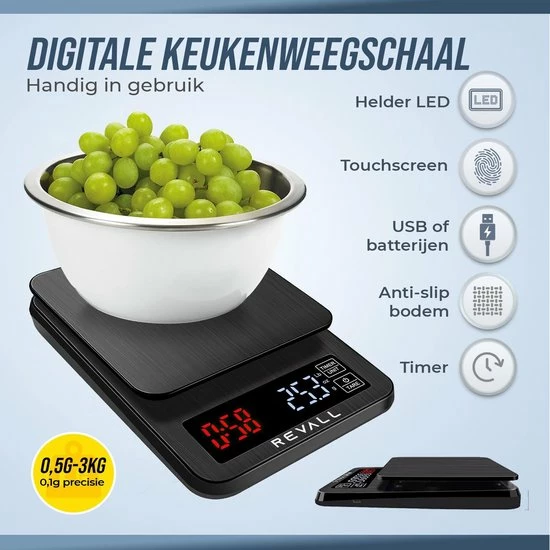Een goede keukenweegschaal is het geheime ingrediënt van elke keuken! Met de REVALL Digitale Precisie Keukenweegschaal kan je van 0,5 gram tot 3 kilogram wegen. Zo kun je op 0,1 gram nauwkeurig jouw ingrediënten, sieraden of medicijnen afwegen! De gewichtseenheid is instelbaar op: gram, pond en ons. Daarnaast is de weegschaal voorzien van een handige tare weegfunctie. Waardoor je het gewicht kan resetten, als er een schaal of kom geplaatst wordt op het platform.