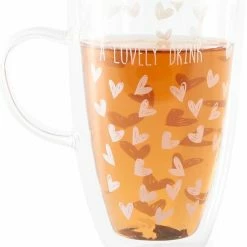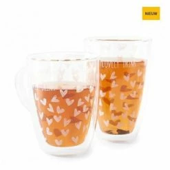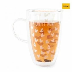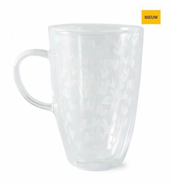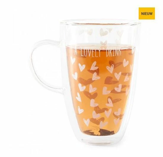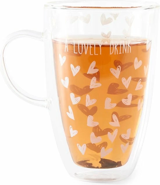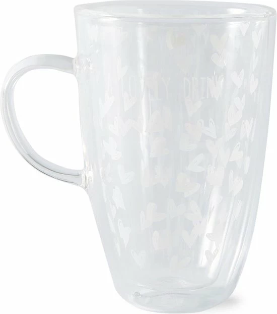 Schenk deze mok maar eens goed vol met dampende thee of juist iets verfrissends, want in deze dubbelwandige mok zal iedere drank lang op de juiste temperatuur blijven. Het design met vrolijke, witte hartjes zit slim verwerkt tussen de dubbele lagen glas. Zo blijft deze glazen mok lang mooi.