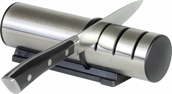 De Sareva messenslijper RVS is te gebruiken voor koksmessen, keukenmessen, schilmesjes en vleesmessen. De messenslijper heeft drie verschillende fases: fijn, keramisch en grof. In deze messenslijper zitten wieltjes, waardoor je je mes naar je toe kunt halen en van je af kunt duwen. Door deze combinatie zal je mes perfect geslepen worden.