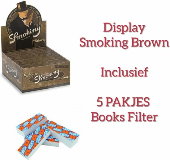 Haal extra vloeipapier in huis met het voordeelpakket van Smoking Brown. Het pakket bestaat uit 1 Smoking Brown display doos in de kleur bruin, 50 pakken Smoking Brown vloeipapier en 5 pakken Original Books filter tips. De display is behalve mooi ook erg handig om alles op 1 plek op te bergen.