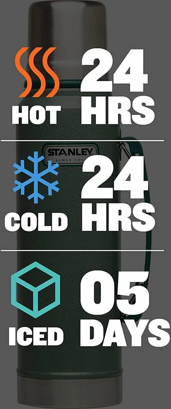 28 uur warm – 28 uur koud Ideaal om warme en koude dranken in mee te nemen. Warme dranken blijven 28 uur warm. Wat verstaat Stanley dan onder warm? Je drank behoudt dan een temperatuur tussen de 100 en 65 graden. Kouden dranken blijven tot wel 28 uur koud; ideaal voor in de zomer!