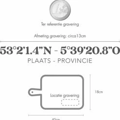 Persoonlijke houten serveerplank van Lemmer – Friesland. De borrelplank heeft een scherpe lasergravure met de naam en exacte coordinaten van Lemmer in de provincie Friesland. Naast het serveren van hapjes kun je deze plank ook een mooie plek geven in je interieur. Een prachtige herinnering aan de stad waar je bent geboren, het dorp waar je woont of de plaats waar je verliefd bent geworden! | Vervaardigd in Nederland en snel verzonden! | Serveerplanken houden niet van vaatwassers. | Hout is een natuurproduct, licht kleurverschil is mogelijk. | Tip: behandel de serveerplank periodiek met snijplank- of druivenpit-olie. |