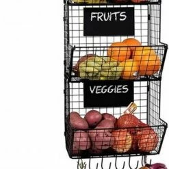 Dit is de eerste ophangbare fruitmand ‘aan de muur’ op BOL.com! Deze fruitmand is uniek omdat je deze aan de wand kunt monteren of op de grond kunt zetten. Ook is het mogelijk de drie delen los van elkaar op te hangen. Door zijn grote manden kan je er oneindig veel groente en fruit in doen, in combinatie met de meegeven haakjes is het ook te gebruiken als bananenhouder/ druivenhouder. En omdat je deze fruitmand kan ophangen staat het niet in de weg op tafel of op het aanrecht.