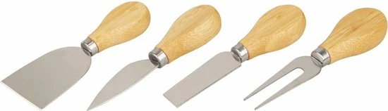 ‣ 1x borrelplank van Bamboe hout, 4 x rvs kaasmesjes met standaard