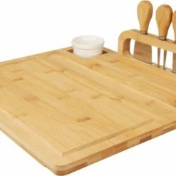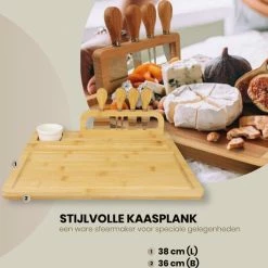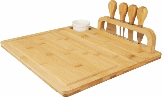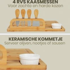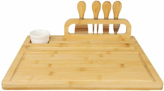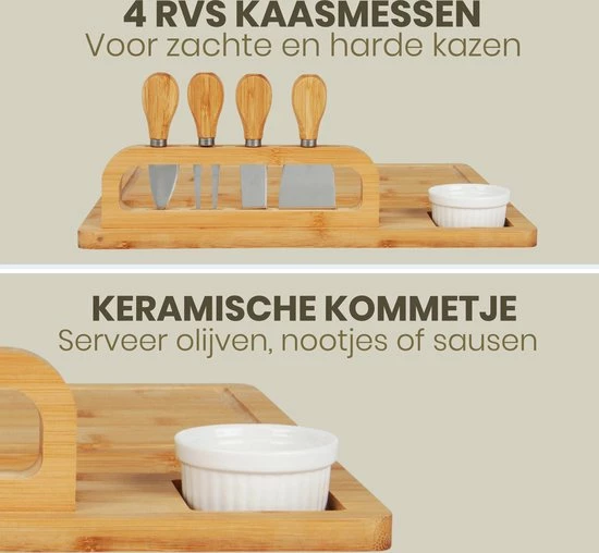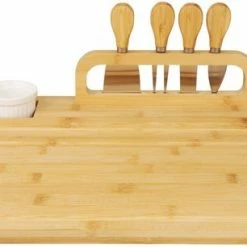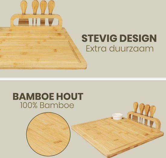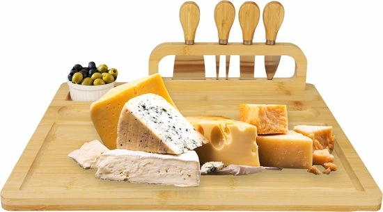 Een luxe Bamboe houten serveerplank met RVS kaasmesjes!