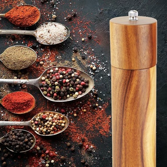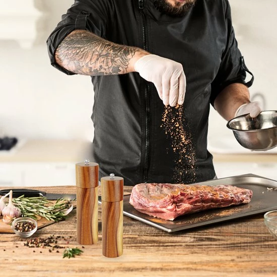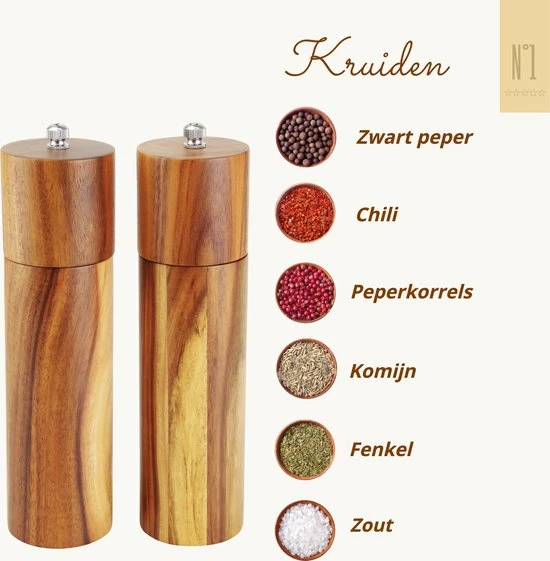 Deze luxe peper en zoutmolen zijn gemaakt van Acacia hout peper en worden handmatig geproduceerd volgens hoge standaard. Dit kunt u herkennen aan de verwerking van RVS in combinatie met het diep donkere hout. Deze molens zijn voorzien van keramische maalschijven die langdurig mee gaan, zodat u alle specerijen optimaal kunt vermalen en dat u er jaren lang plezier van zult hebben. Uw gasten zullen met gemak deze molen kunnen bedienen en er zal geen residu achterblijven zodat het “grinden” soepel blijft.