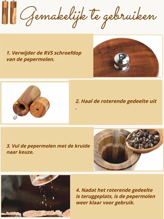 “Welke Peper of Zoutmolen je ook kiest, wanneer je je kruiden vers maalt zal het je gerechten qua smaak naar een niveau tillen. Het zorgt net voor een beetje extra smaakbeleving. Kruiden dat al gemalen in een potje zit heeft minder smaak en je kan dan ook niet kiezen hoe grof je je kruiden gemalen wilt hebben.”.