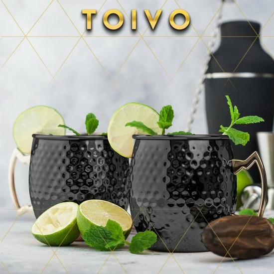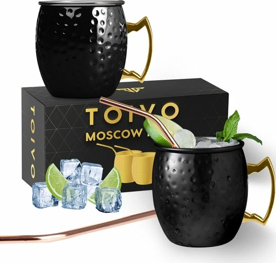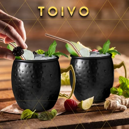 Toivo Moscow Mule Bekers – Zwart – met RVS Rietjes – Set van 2 Stuks – Verkoperd – 500 ML