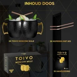 De set bevat twee TOIOV Moscow Mule bekers, Twee koperen rietjes, een TOIVO Handleiding en een GRATIS E-Book met daarin een heleboel recepten en tips voor dè perfecte cocktail!