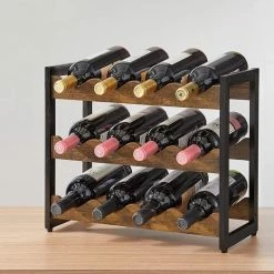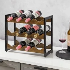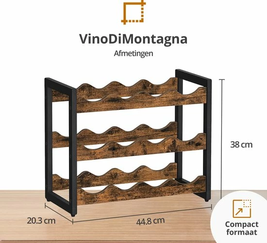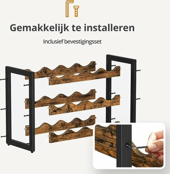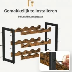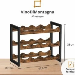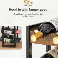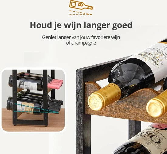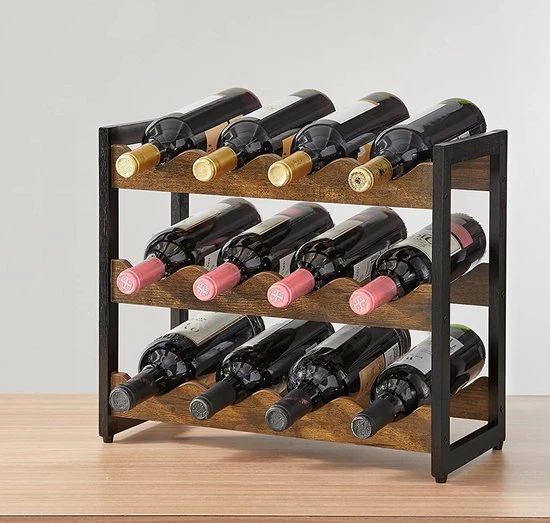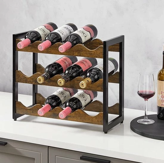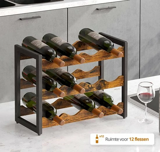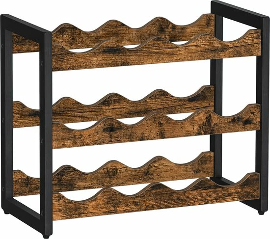 Dit wijnrek in industriële stijl kan tot 12 flessen wijn bevatten. De stevige materialen maken het duurzaam en de golfstructuur voorkomt dat flessen kantelen, vallen en wiebelen.
