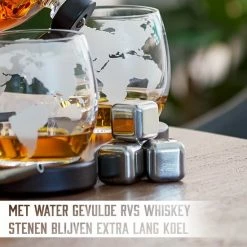 De meegeleverde accessoires maken de whiskey beleving helemaal compleet. Schenk de whiskey karaf vol zonder dure whiskey te morsen doormiddel van de schenktuit. Plaats vervolgens de ijskoude roestvrijstalen stenen veilig in de 4 bijpassende wereldbol whiskey glazen met de ijstang. Deze rvs whiskey stenen hebben als grote voordeel dat ze niet smelten en dus je whiskey niet verdunnen! Hierdoor blijft je whiskey puur van smaak. Schenk tot slot de whiskey in het glas en genieten maar!