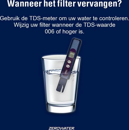 Om de exacte levensduur van het filter zelf te kunnen vaststellen, wordt er een TDS meter meegegeven. Doe deze periodiek in het gefilterde water. In de handleiding lees je hoe de TDS meter aangeeft wanneer het filter toe is aan vervanging.